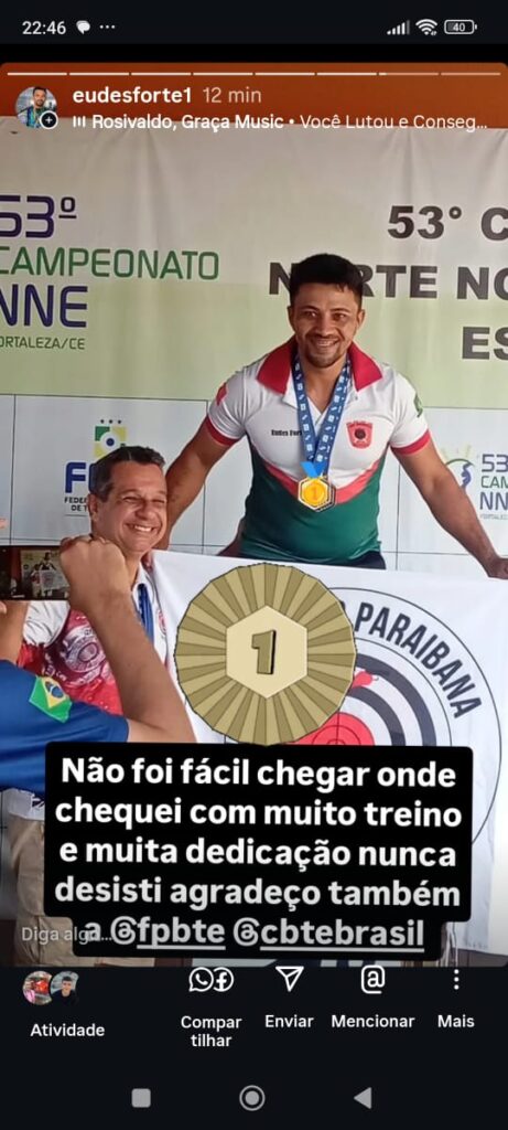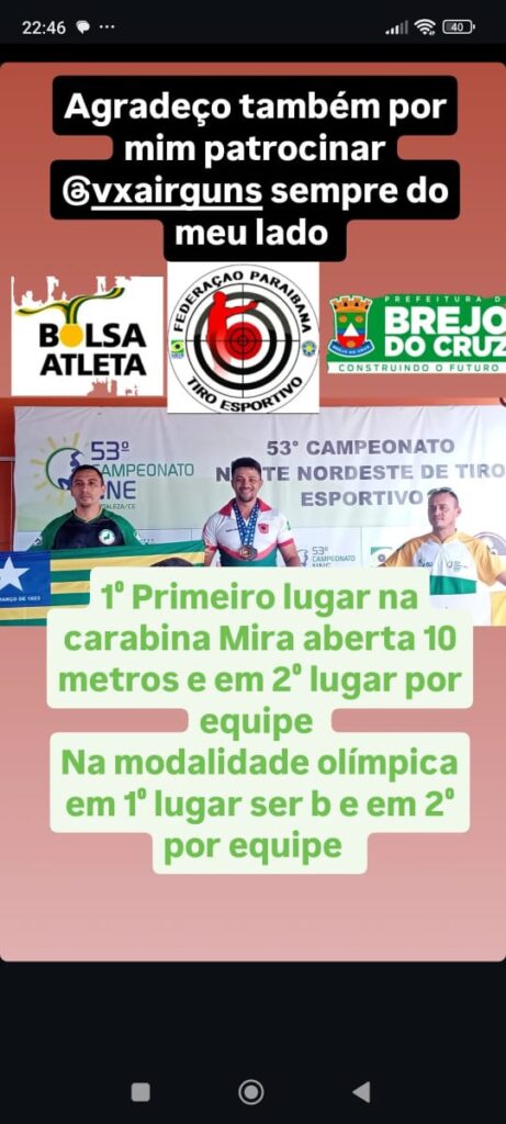 [No último final de semana o atleta Eudes forte participou do campeonato norte e nordeste que também faz parte do campeonato brasileiro de tiro esportivo. O mesmo foi campeão na categoria carabina mira aberta. Estreando na modalidade olímpica também foi campeão na série B e vice campeão por equipe . Em Entrevista ao nosso portal o atleta Eudes falou está muito confiante na próxima já ficar na série.” Quero Agradecerbprimeiramente a Deus, a minha esposa e a prefeitura de brejo do cruz na pessoa de Dr Thales e também ao professor Deny”. Por fim agradeceu a todos os amigos e familiares que sempre contribuíram direto e indiretamente para que ele pudesse chegar ao esporte, ajudando o mesmo nessa grande caminhada.