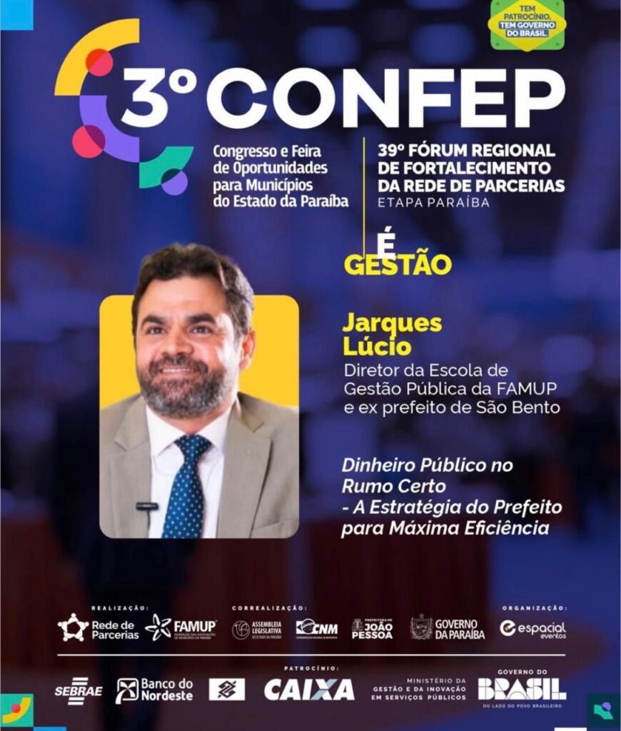 O diretor da Escola de Gestão Pública da FAMUP e ex-prefeito de São Bento, Dr. Jarques, será um dos palestrantes de destaque da terceira edição do CONFEP (Congresso e Feira de Oportunidades para Municípios do Estado da Paraíba). O evento, que integra o 39º Fórum Regional de Fortalecimento da Rede de Parcerias, consolidou-se como o maior epicentro de discussões sobre inovação e municipalismo no estado.