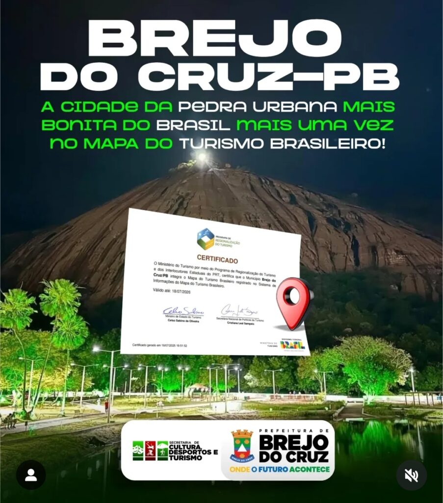 O Ministério do Turismo certificou e homologou o município de Brejo do Cruz como integrante do Mapa do Turismo Brasileiro 2025.